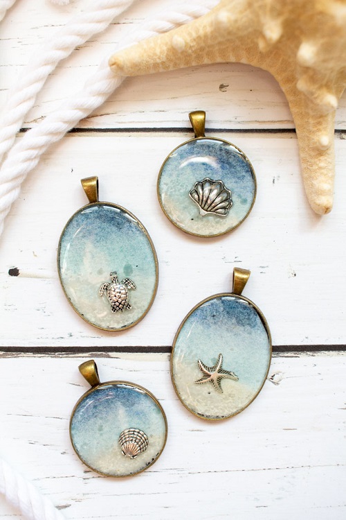 How about something with seashells in it? This beautiful seashore resin pendant does make a statement!