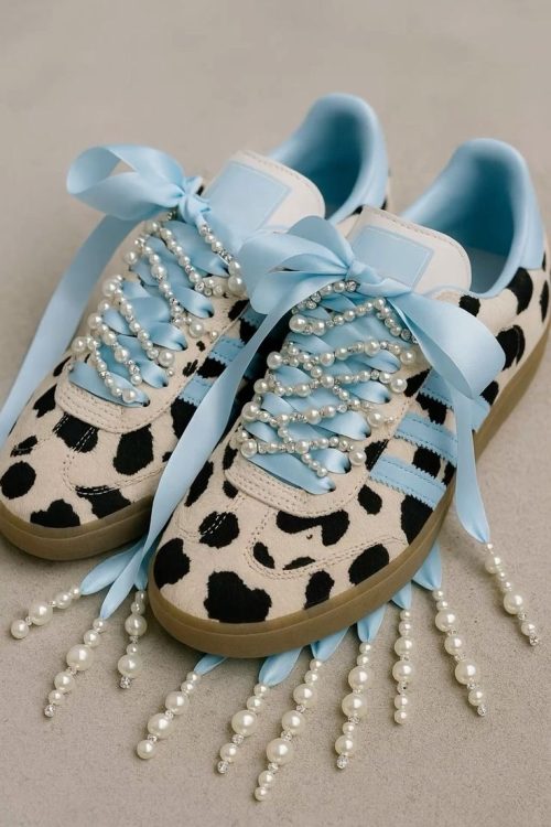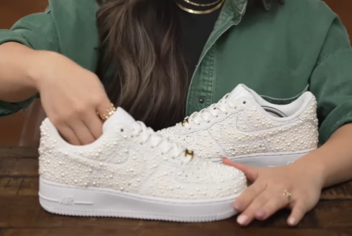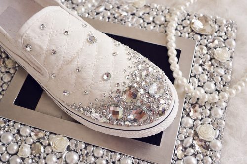 You can turn basic white kicks into a high-fashion statement by encrusting the entire surface with varying pearl sizes. Here’s more about them.