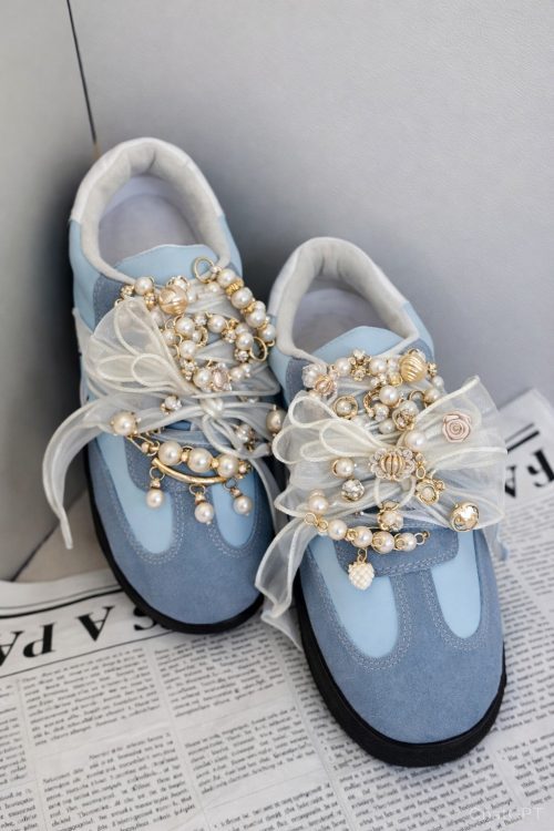 These DIY sneakers transform a simple pair of blue suede trainers into a maximalist statement piece by layering delicate tulle bows with an array of pearls and gold charms.