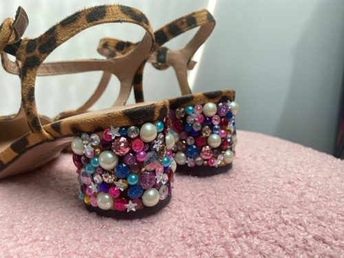 Go wild by mixing classic pearls with multicolored rhinestones on your chunky heels. If you do this, you’ll create a mosaic masterpiece that turns heads from every single angle.