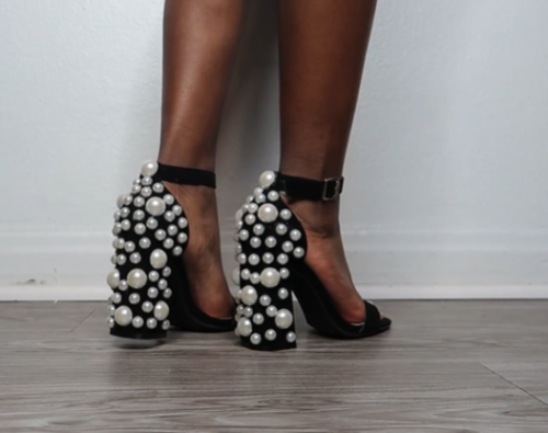 You can make a sophisticated splash by spacing large pearls across dark block heels for a 3D polka-dot effect. It’s a good DIY way to add high-contrast drama to sandals.