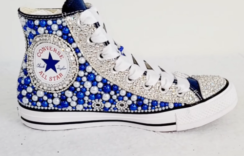 Get ready to rock by blending deep blue pearls with shimmering crystals on your favorite canvas high-tops. You’ll love this celestial design!