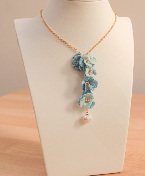 These wire crochet uses thin metal wire and a small hook to create a woven necklace that mimics lace but with a metallic sheen. It is ideal for a modern yet romantic bridal accessory.