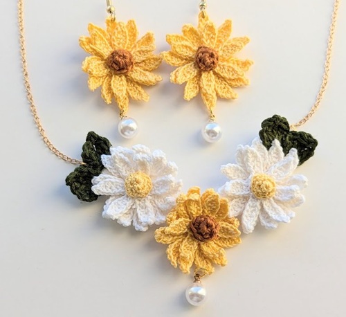 Add a touch of elegance with this floral necklace-and-earring set featuring layered daisy petals and hanging pearls. You can create your own delicate version here.