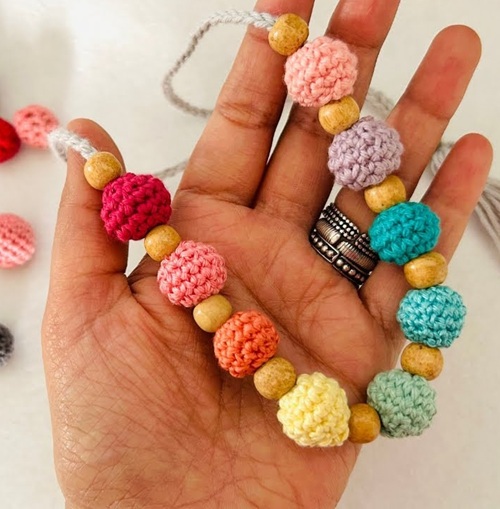 You will enjoy wearing this soft pastel bead necklace that mixes wooden and crocheted beads for a handcrafted finish. Make your own version here.