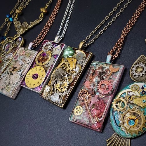 Do something unique and combine vintage gears and tiny watch parts into a steampunk-inspired necklace. The mix of metal components gives industrial chic to wearable art. Here is the idea.