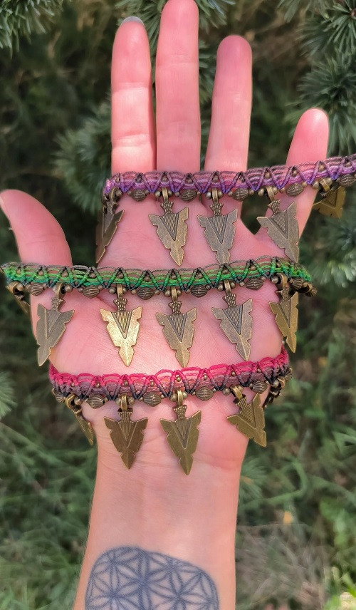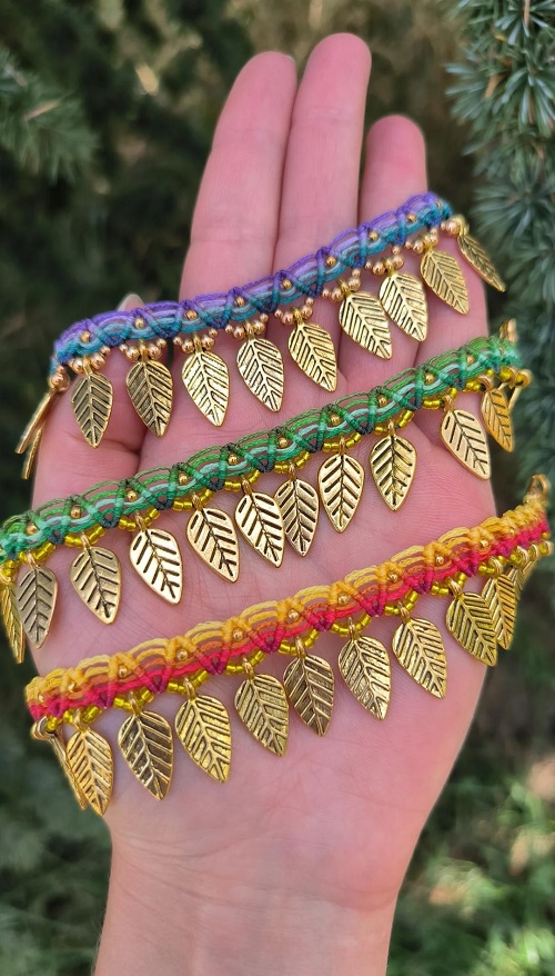 Another one so bright and cheerful! Shiny golden leaf charms paired with macrame knots make for a stunning anklet that works well with festive outfits.