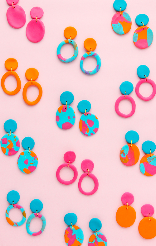 Let’s begin with these bright and colorful polymer clay earrings. You can add small bits of pink and orange clay to the blue base.